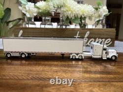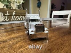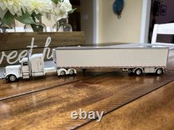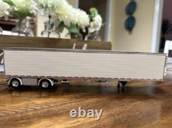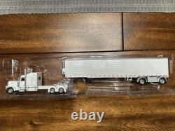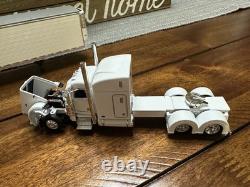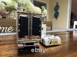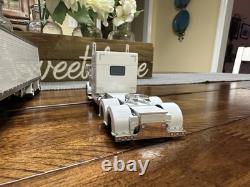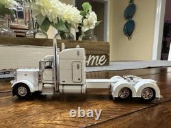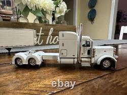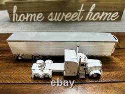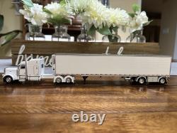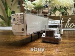 This listing is for a Die-Cast Promotions 1/64 scale Owner Operator Peterbilt 379 63 mid roof sleeper tractor with spread axle Utility 53' reefer trailer. Tractor and trailer are solid white with chrome accents. Features include: lifting hood with detailed engine bay and motor, detailed cab interior, real rubber tires with working suspension, chrome tractor and trailer wheels, chrome dual exhaust stacks, chrome grill with double bubble headlights, white show fenders, white deck plate, chrome steps with white air tanks, chrome mirrors, chrome Texas bumper with white lights, white drop visor, chrome breathers, white fuel tanks with chrome straps, chrome fifth wheel, chrome T-bar with white lights, functioning trailer landing gear, detailed white and chrome Thermo King refrigeration unit with dual rear mounted chrome fuel tanks, chrome rope boxes on driver and passenger side, opening dual mirrored chrome swing doors on trailer rear, and white show fenders on trailer. Absolutely awesome looking custom show truck set in mint condition.